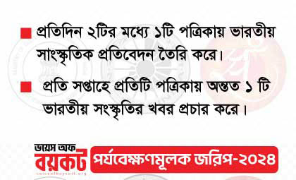 ভয়েস অফ বয়কট মোট ৯ টি বাংলাদেশের প্রথমসারির ইংরেজি বাংলা মাধ্যমের সংবাদপত্রসমূহের একটি গভীর পর্যবেক্ষণমূলক জরিপ করেছেন, জরিপের সময়কাল এপ্রিল ও নভেম্বর ২০২৪ (মোট ৬০দিন) উাপাত্ত সংগ্রহ করেছেন। তাতে দেখা যায়, বাংলাদেশের প্রথম আলো পত্রিকার বিনোদন পাতায় নিয়মিত ভারতীয় শোবিজের নূন্যতম ১টি কনটেন্ট ছাপিয়েছেন। যা দেশীয় সংস্কৃতির জন্য একটি বড় হুমকি হিসেবে দেখা যাচ্ছে। এসব কনটেন্ট শুধু ভারতীয় তারকাদের গ্ল্যামার আর ব্যক্তিগত জীবনের গল্প তুলে ধরেই থেমে থাকে না; বরং বাংলাদেশের তরুণ সমাজকে তাদের প্রতি অতি নির্ভরশীল করে তোলে। পত্রিকাটির অনলাইন সংস্করণে বলিউড-ঢালিউড ট্যাগে আলদা প্রতিবেদন প্রচার করা হয়, ফলে স্থানীয় শিল্পী এবং কনটেন্ট নির্মাতারা প্রচারের ক্ষেত্রে পিছিয়ে পড়ছেন। যদিও পত্রিকাটির ঢালিউড ও হলিউড ট্যাগে অপর্যান্ত প্রতিবেদন পাওয়া যায়। প্রিন্ট মিডিয়া দ্বারা ভারতীয় সংস্কৃতির এই একচ্ছত্র প্রভাব আমাদের নিজস্ব ঐতিহ্য ও সংস্কৃতির জায়গা সংকুচিত করছে।